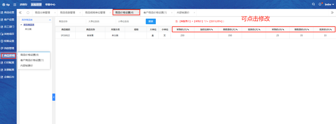 在【系统管理-商品价格】进行设置商品价格、客户商品价格及内部核算价,具体操作详见企微社区,搜索关键字查看。