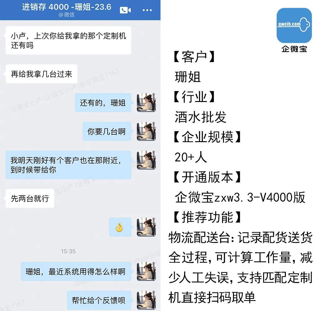 那后来我是怎么发现企微宝的?说来也挺有缘分的。我那天去朋友家泡茶了,刚好小卢也到我朋友那儿去宣传企微宝,我跟着听了一会儿,就顺便问了那么一嘴,没想到企微宝的物流配送的功能还挺符合我的想法的。我先买了一年的系统打算试试,按照小卢的推荐还顺带买了几个定制机。