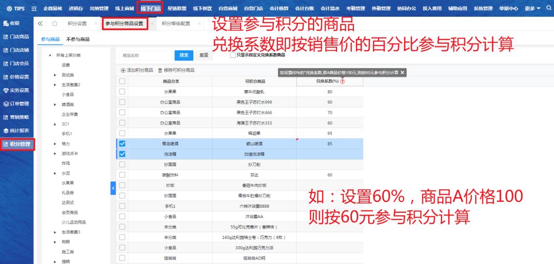 商家可以根据自身情况定制积分商品,积分可以全额或部分抵扣商品价格,客户只需要支付商品剩余价格即可。例如:某商品的积分抵扣系数为60%,客户如果拥有足够的积分,就可以只用原价的40%买下该商品。