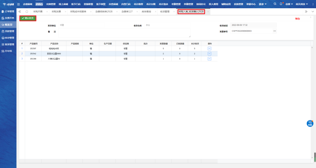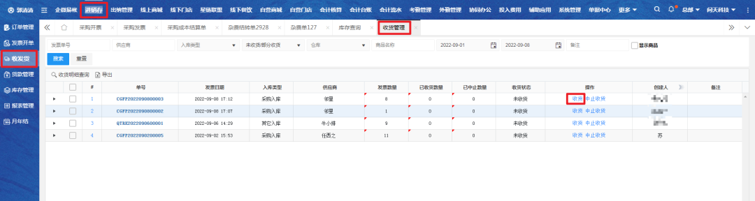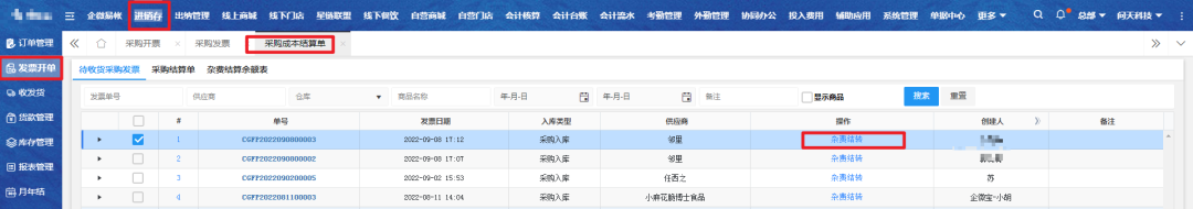 二、进入待收货采购发票页面,点击对应单据进行杂费结转;
