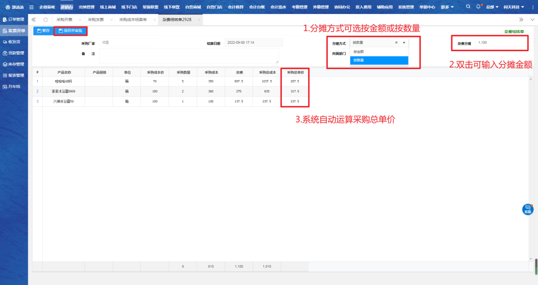 杂费结转分摊方式可选择按金额或者按数量,双击可输入分摊金额(部分/全部),系统自动运算采购总单价,保存并审批。