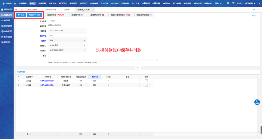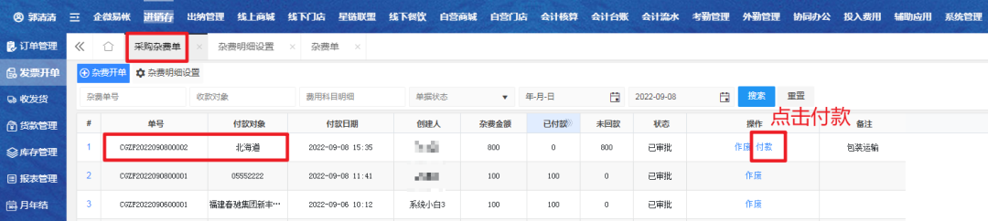 二、回到采购杂费单页面,选择对应单据点击付款;
