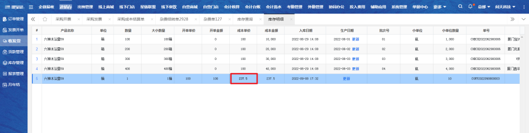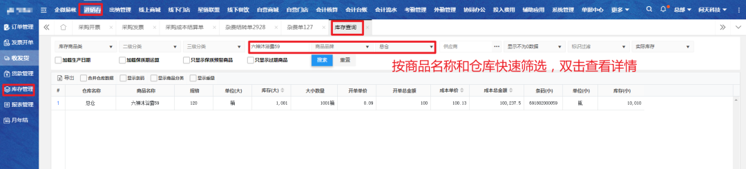 一、进入库存查询页面,按商品名称和仓库筛选,双击查看详情。