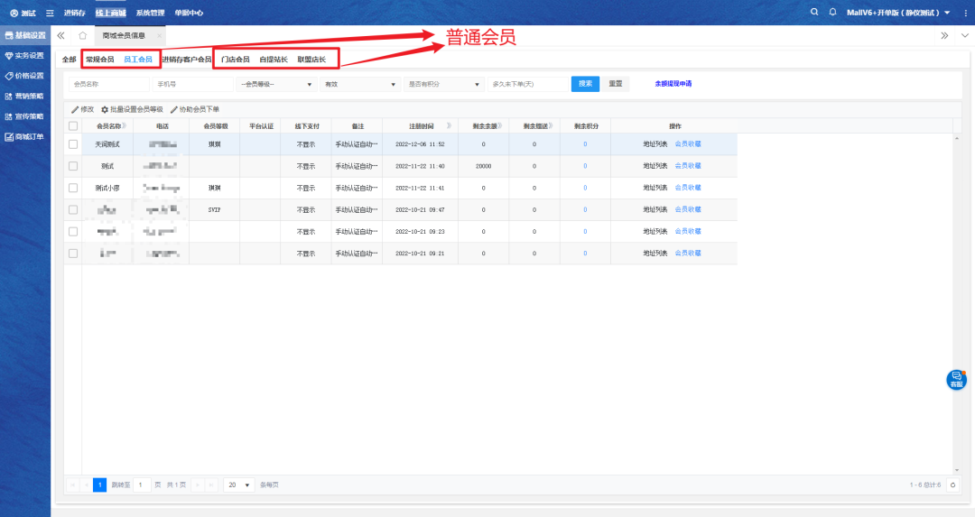 一、进入商城会员信息页面,查看常规会员、员工会员、门店会员等这几类普通会员。