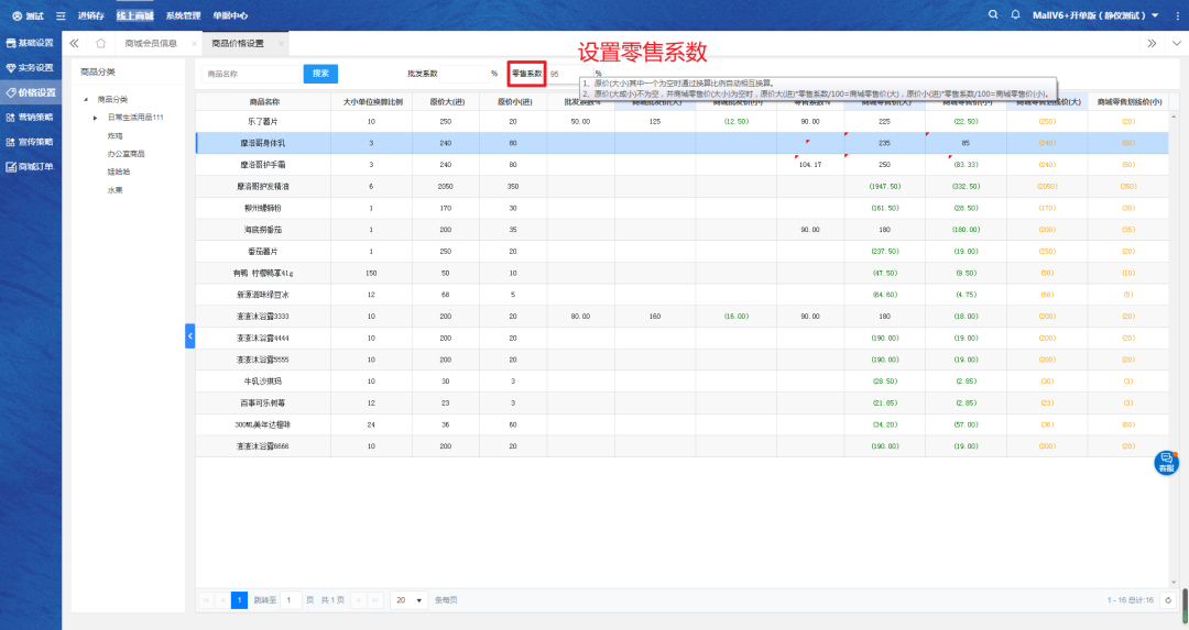 一、在商品价格设置页面,选择设置单一商品大小单位的零售价,也可设置零售系数。
