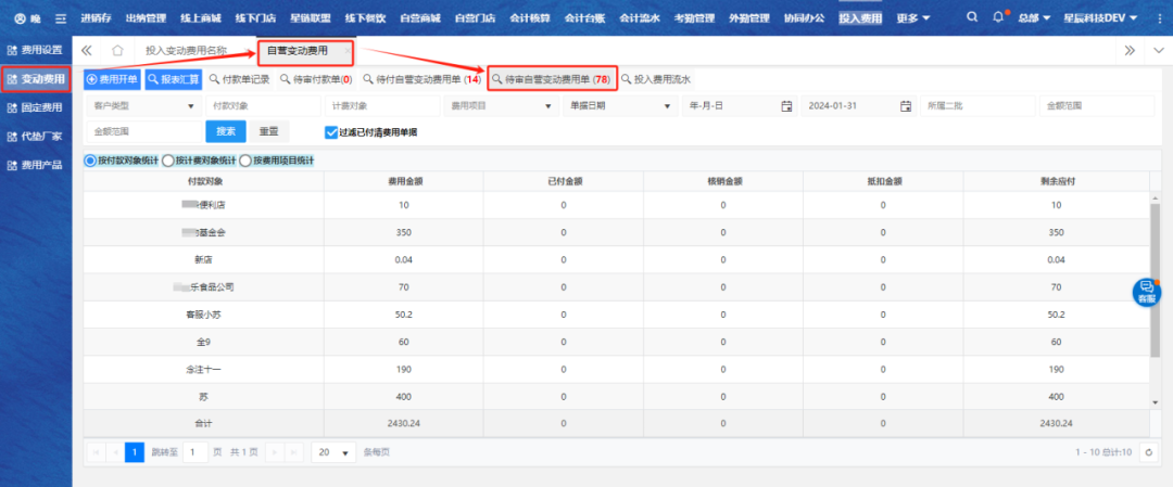 二、【投入费用-变动费用-自营变动费用】,点击“待付自营变动费用单”。