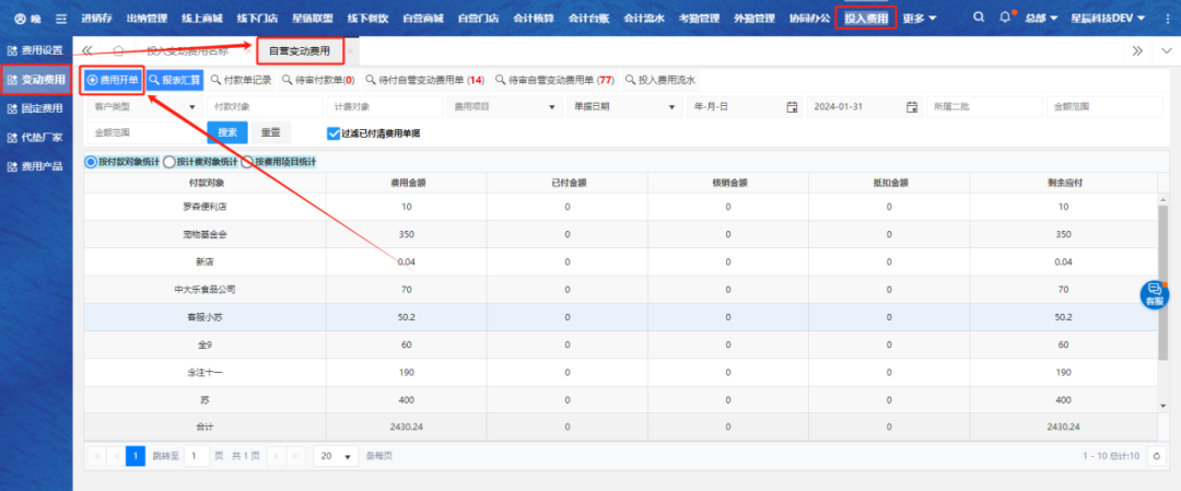 【投入费用-变动费用-自营变动费用】,点击左上角“费用开单”进行开单。