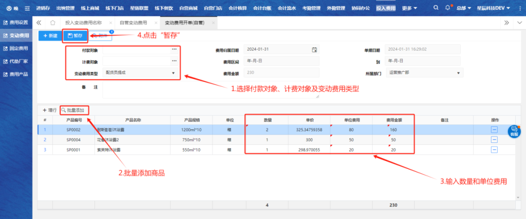 选择付款对象和计费对象、变动费用类型,添加产品并输入数量和单位费用,点击“暂存”。