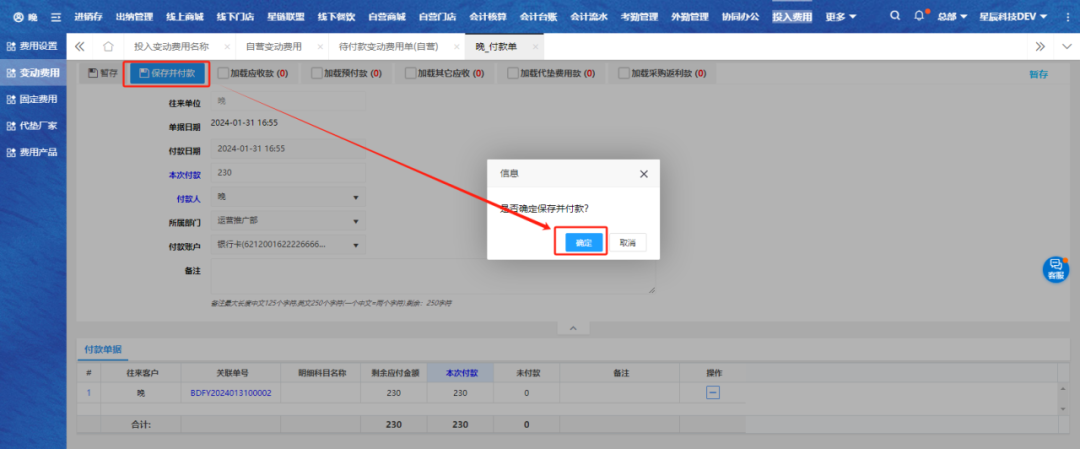 三、【投入费用-变动费用-自营变动费用】,点击“付款单记录”进行查看。