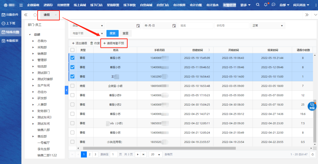 另一种则是先休假后请假,由于突发原因需要请假并且在提交请教申请前,考勤记录已经先判定为缺勤了,这时候员工就可以补交请假申请。企业人事只需要选择该请假申请,点击【请假考勤干预】,就可以一键进行干预,将对应时间段的缺勤记录变成请假状态。