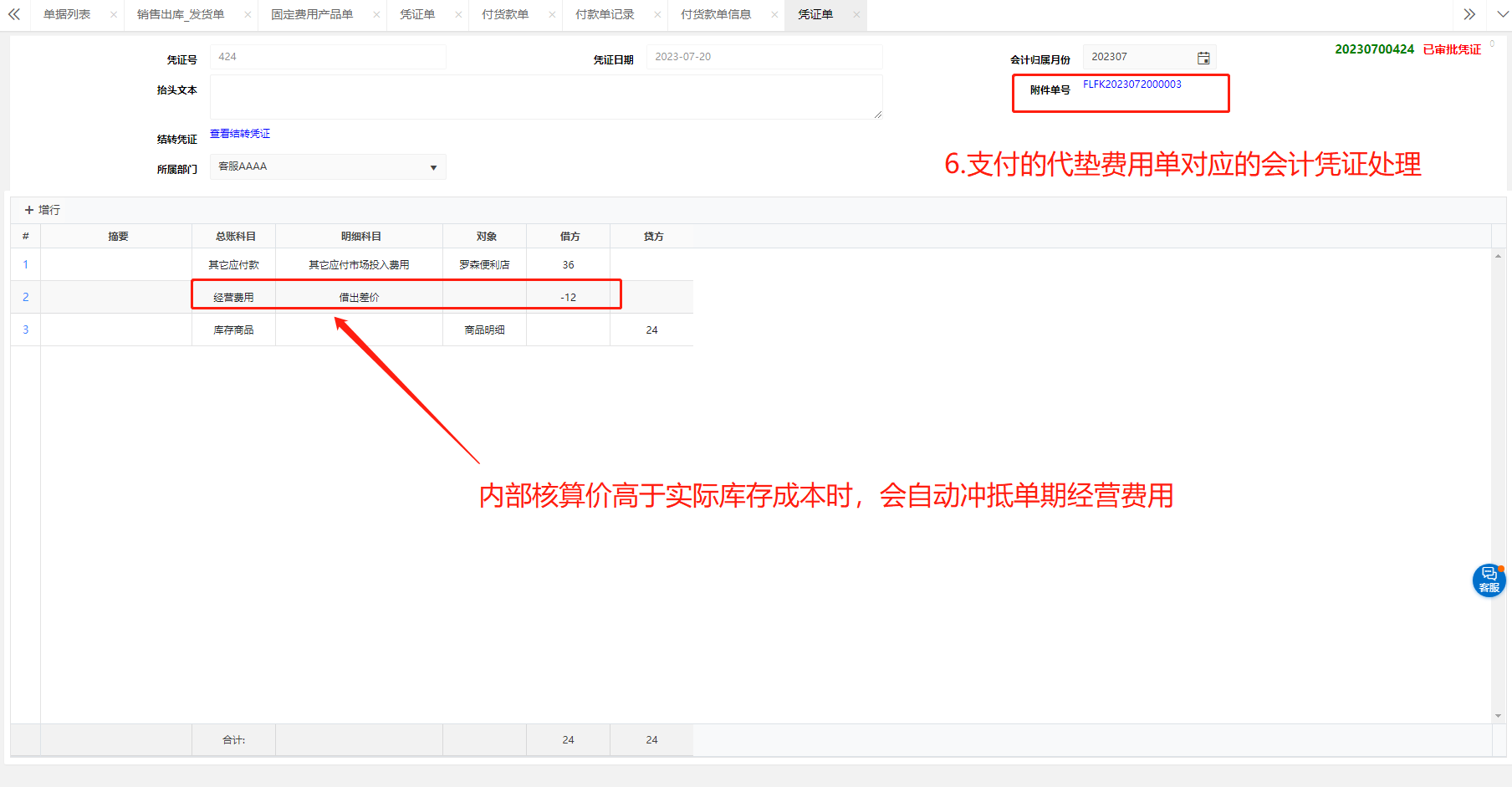 6.查看支付的代垫费用对应的会计凭证处理,内部核算价高于实际库存成本时,会自动冲抵单期经营费用。