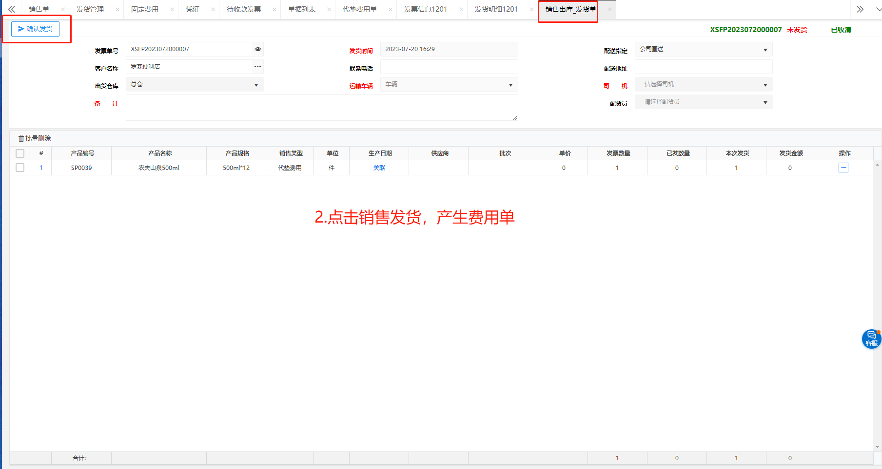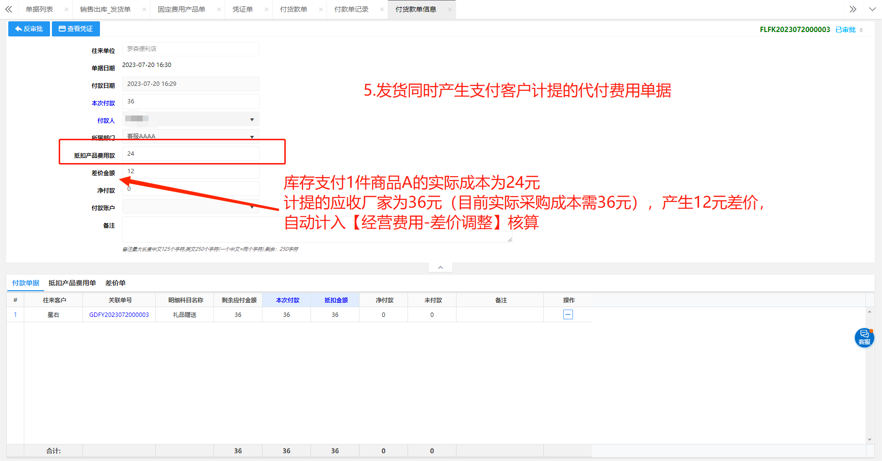 5.发货同时产生支付客户计提的代付费用单据,如:库存支付1件商品A的实际成本为24元,计提的应收厂家为36元(目前实际采购成本需36元),则产生12元差价,自动计入【经营费用-差价调整】核算;
