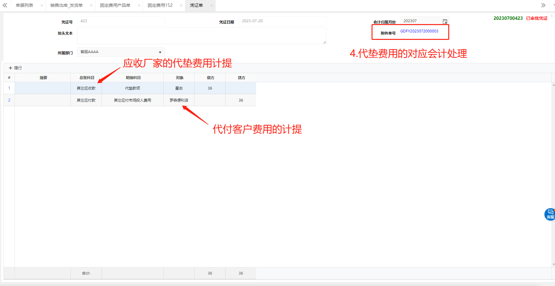 3.自动生成的代垫费用单,按内部核算价计算:1件=36元;
