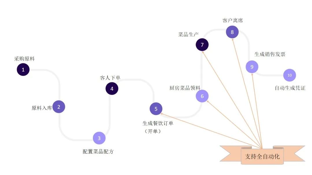传统餐饮系统具备以下功能板块:预订、点菜统、出品打印、送单、结帐、收银、厨房打印等。而企微宝餐饮系统则在传统餐饮系统的基础设置上加入了进销存功能,功能包括:采购原料-原料入库-配置菜品配方-客人下单-生成餐饮订单(开单)-厨房菜品领料-菜品生产-客户离席-生成销售发票-自动生成凭证。