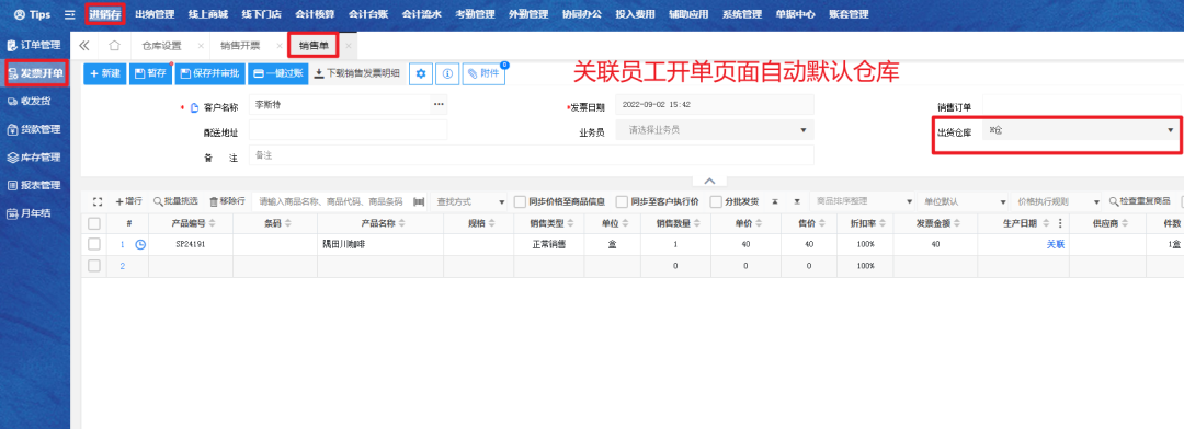 二、业务员在PC端和手机端开单的时候,系统自动选择默认仓库。