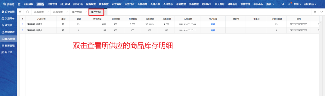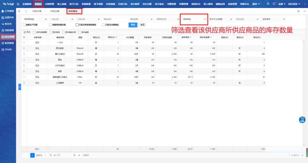 一、进入库存查询页面,筛选供应商,查看对应供应商所供应商品的库存数量;