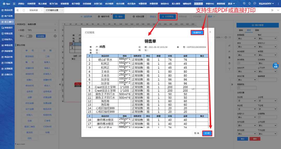 设置完成后,点击打印预览进入预览页面,支持生成PDF格式导出或直接打印;