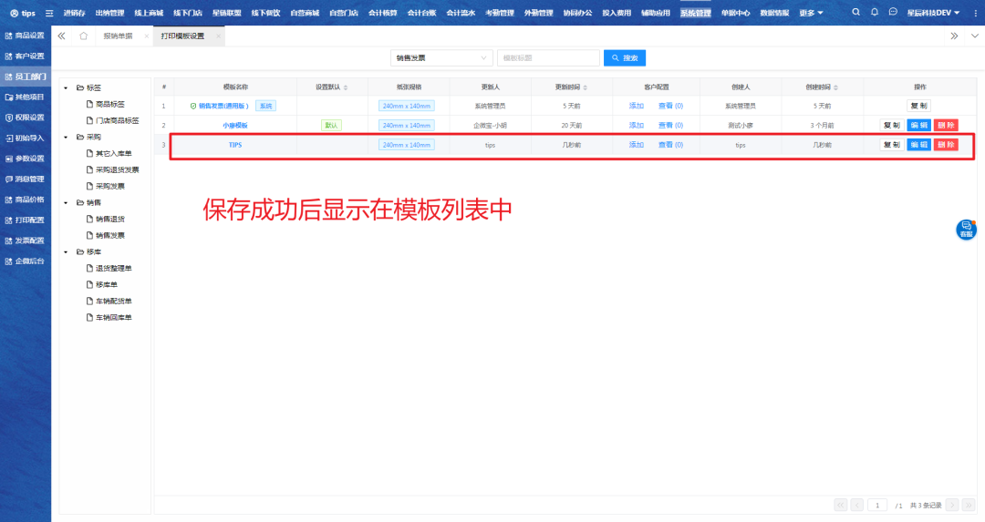 一、进入发票打印模板页面,系统已有的三种单据类型,根据需要进行设置。以销售发票打印模板为例,选中销售发票模板,点击复制进入编辑页面。