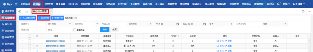 电脑端入口:【进销存】-【发票开单】-【其他出库开单】