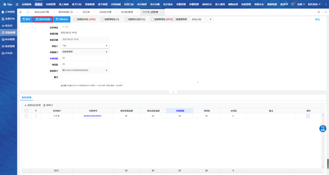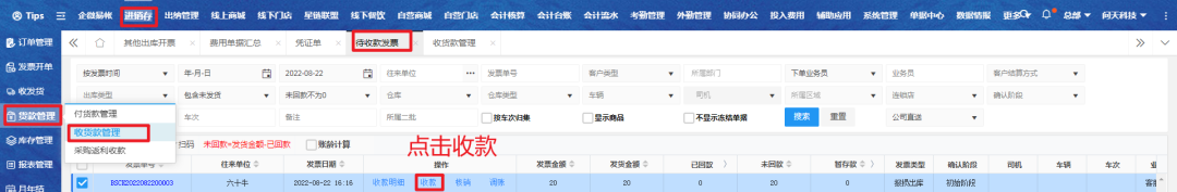 进入收货款管理,点击对应单据进行收款;