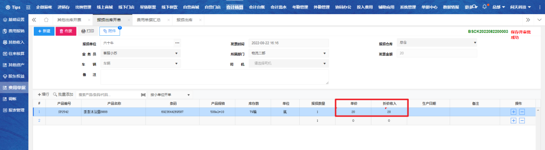 报损开单如上,开单时输入商品剩余价值,保存并审批;