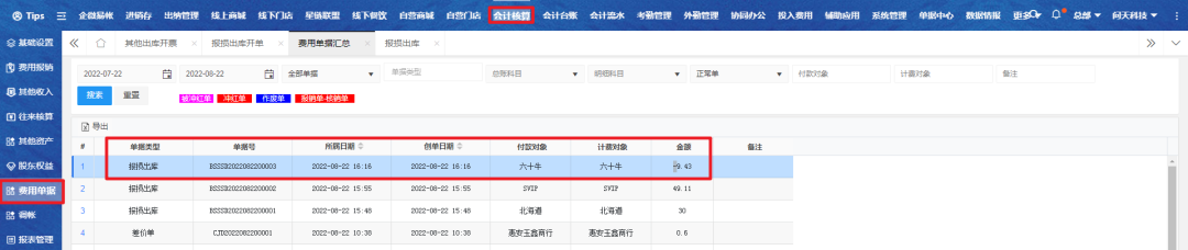 进入费用单据汇总列表,查找对应报损出库单,点击查看详情;