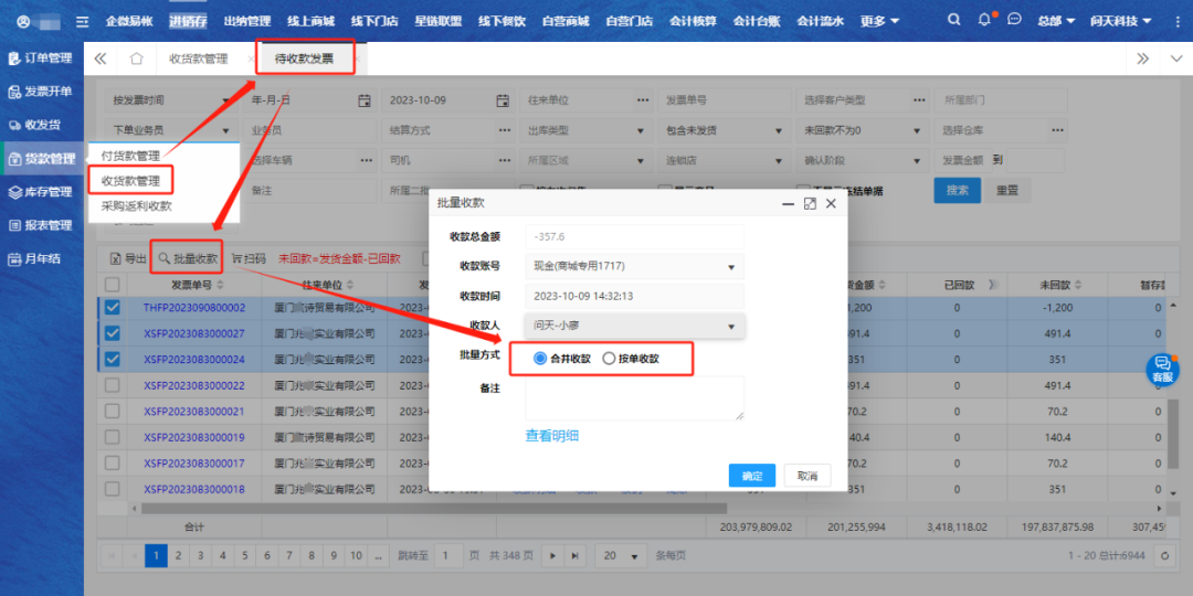 企微宝收款管理的批量收款有两种操作方式。一种是点击【代收款发票】,进入之后可以直接勾选相同客户或者不同客户的多张销售单进行操作,按照合并收款或按单收款的批量方式进行一键收款,对应生成一张收款单或多张收款单。