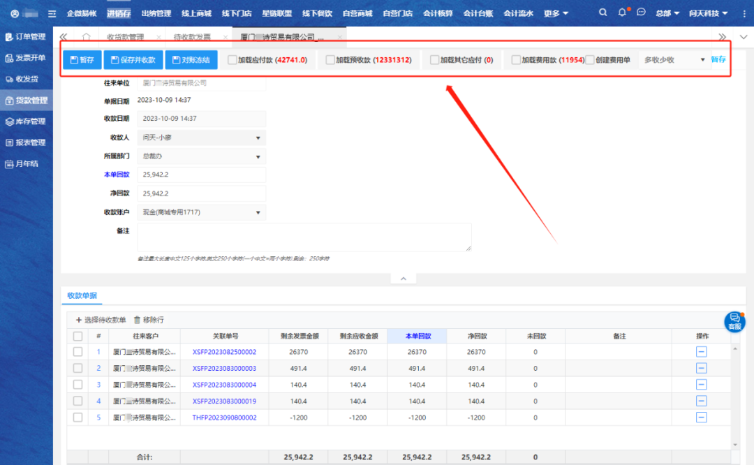 另一种则是选择某一客户进行【按单据收款】,勾选该客户名下需收款的单据进行操作,这个方式能有更多灵活操作的空间,例如加载抵扣费用单、创建费用单、少收多少等。批量收款的方式非常实用,既可以帮助企业提高工作效率,简化收款流程,又可以降低出错率。