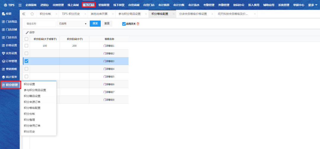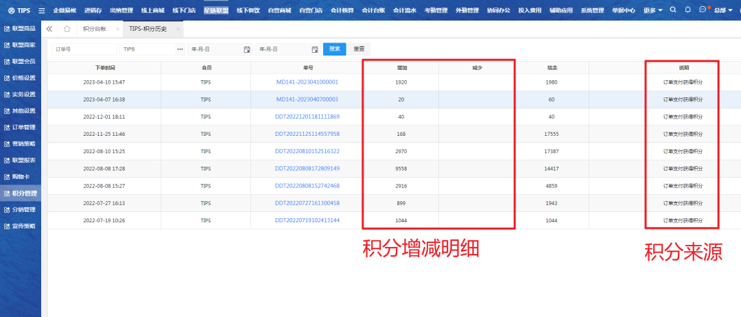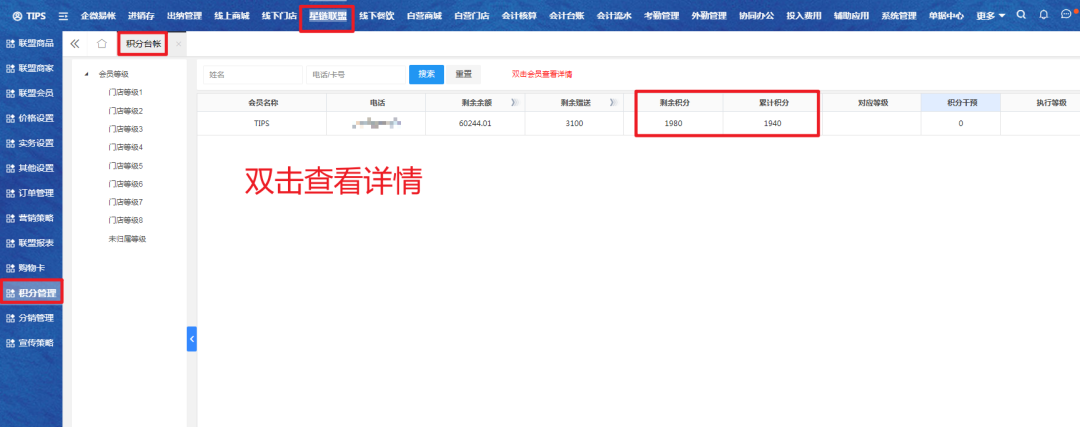 △再进入【星链联盟-积分管理-积分台账】查看对应会员对应的积分以及会员等级。