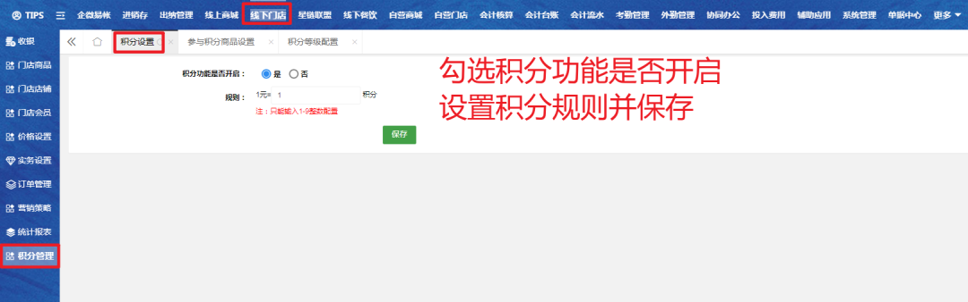 进入积分设置页面,勾选积分功能开启,设置积分规则如:1元=1积分,点击保存。