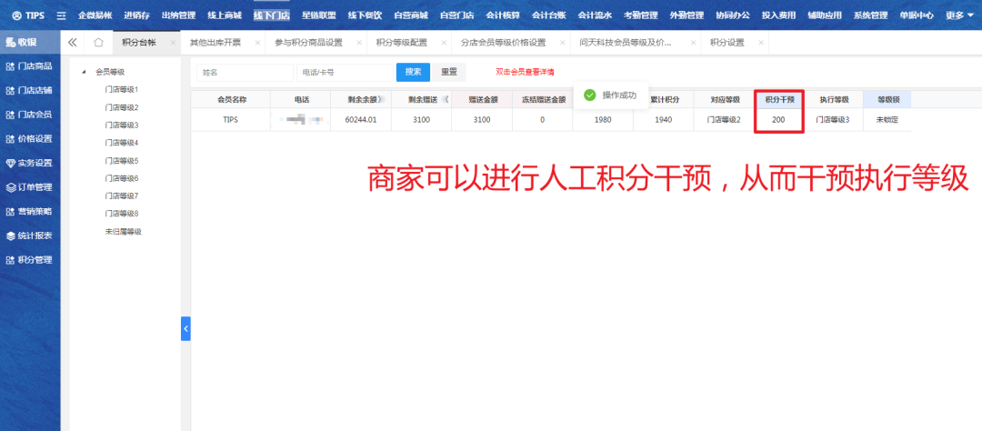 △当积分规则设置好之后,会员进行下单消费,输入会员号消费金额就会按照积分设置进行兑换成积分。