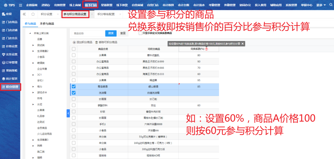 进入参与积分商品设置页面,设置商品兑换洗漱,如:设置60%,商品A价格100元,则按60元参与积分计算。(若未设置,则默认百分百参与积分计算)