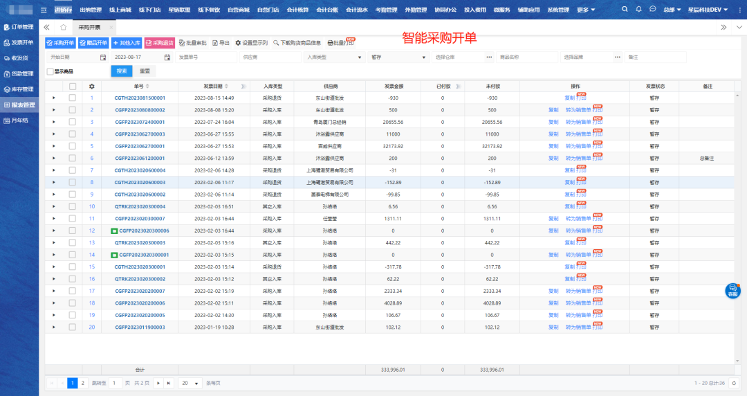 企微宝的采购开单这一功能,是管理员将商品从供应商那边进行采购入库,通过建立和跟踪采购开单、收货以及付款等一系列操作,从而更方便、快捷地录入采购商品信息清单和发票凭证。