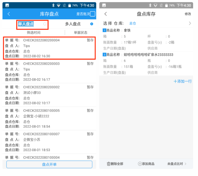 企微宝的进销存模块设置了库存盘点这一功能,企业可以有效的运用该功能进行库存盘点,支持电脑端盘点以及手机端盘点。手机端盘点给企业的库存盘点工作带来了极大的便利。