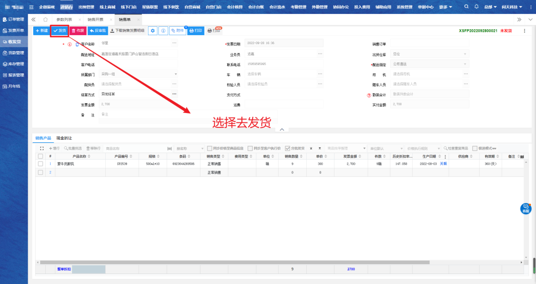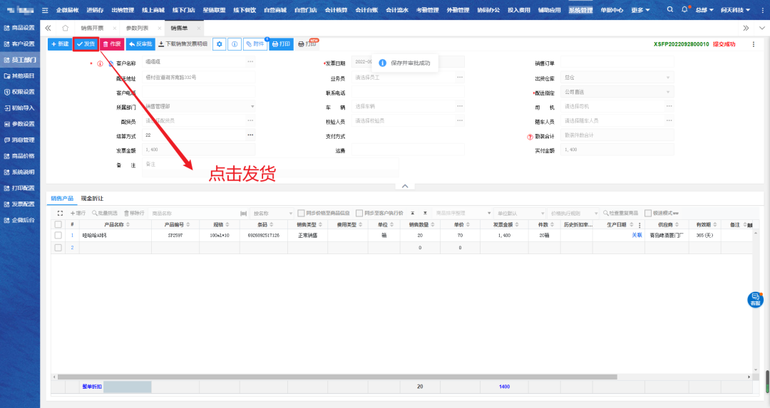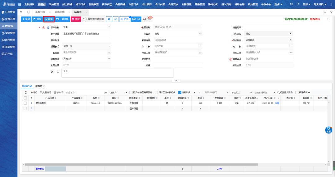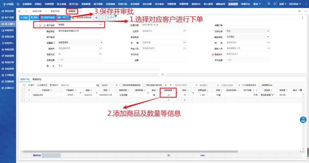 一、进入销售开票页面,选择对应客户进行下单,添加商品及其数量,保存并审批。
