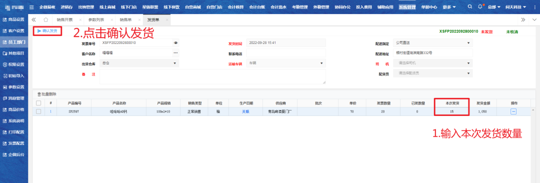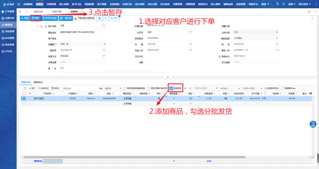 一、进入销售开票页面,选择对应客户进行下单,添加商品及其数量,勾选分批发货,点击暂存;