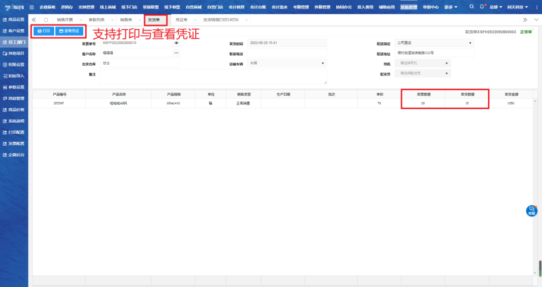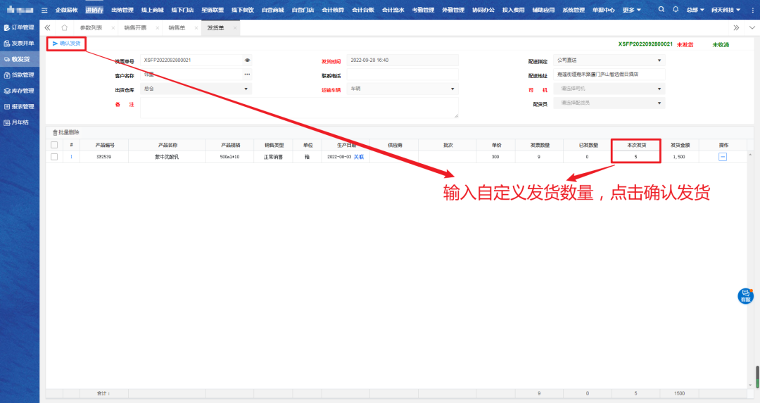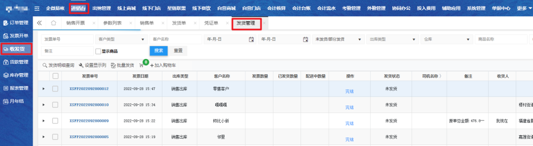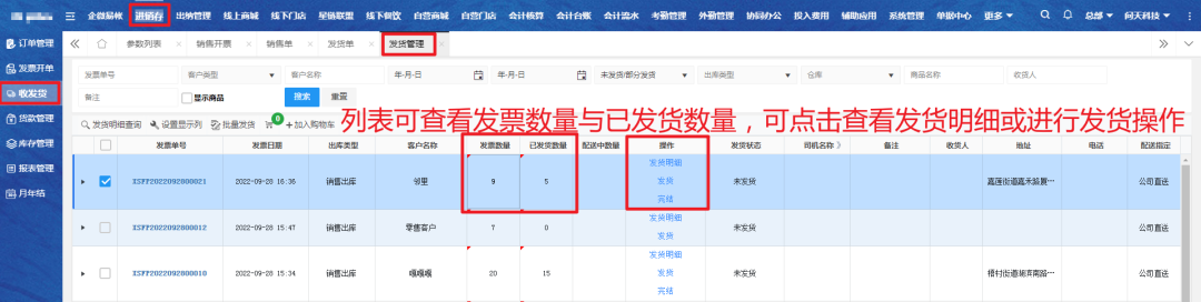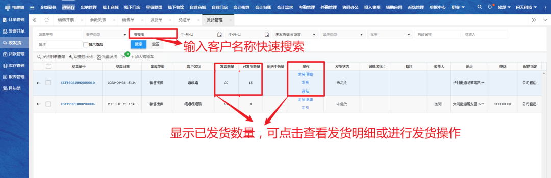 输入客户名称或发票单号快速搜索,列表可显示已发货数量,可点击查看发货明细或进行发货操作。