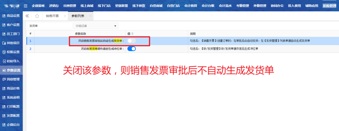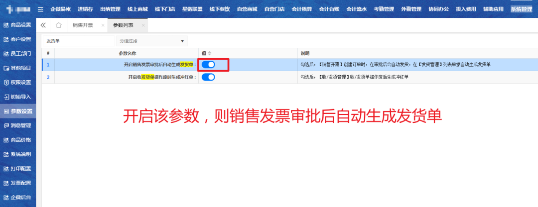 一、进入参数设置页面,开启小数发票审批后自动生成发货单。