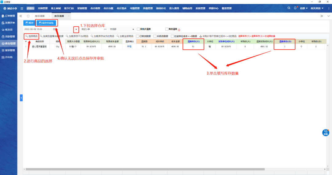 3.如图所示,选择仓库、商品后填写库存数量,确认后点击【保存并审批】(清算库存(大)+清算库存(小)=总清算数量