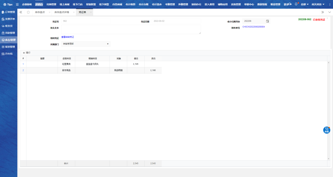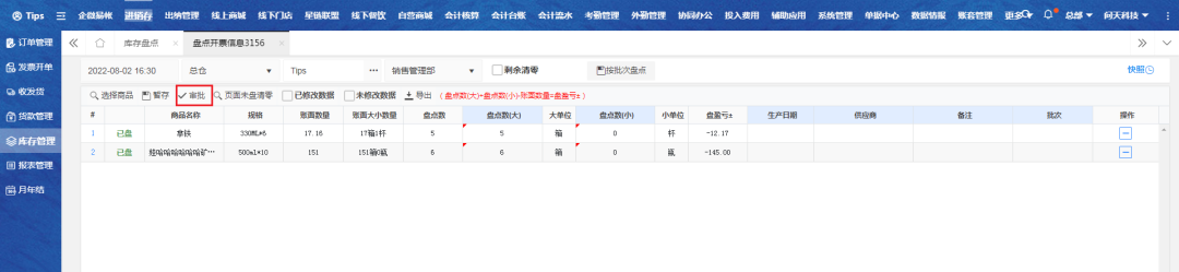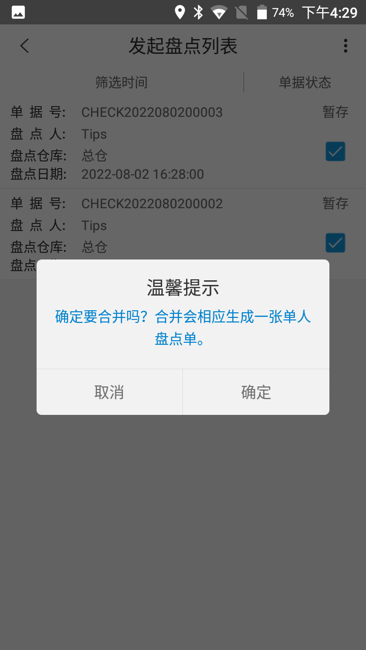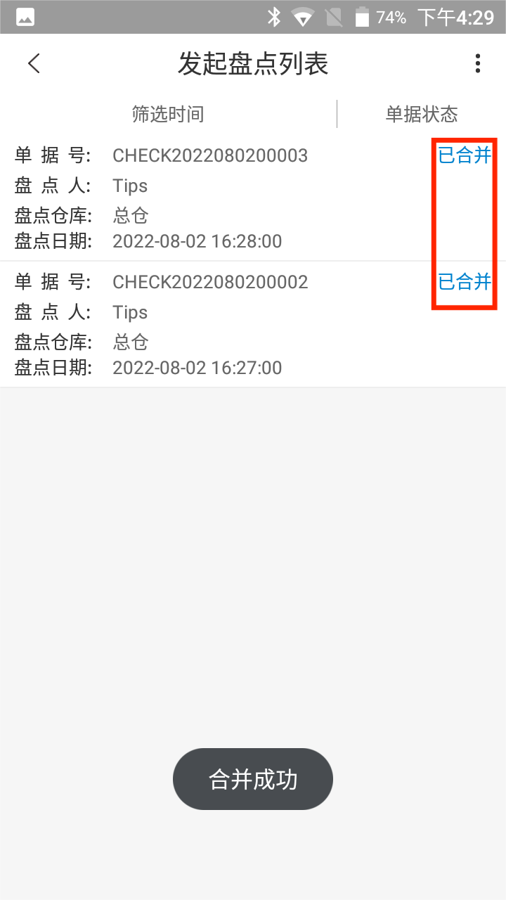 合并完成的单据生成一张单人盘点单,单据状态显示在右侧;