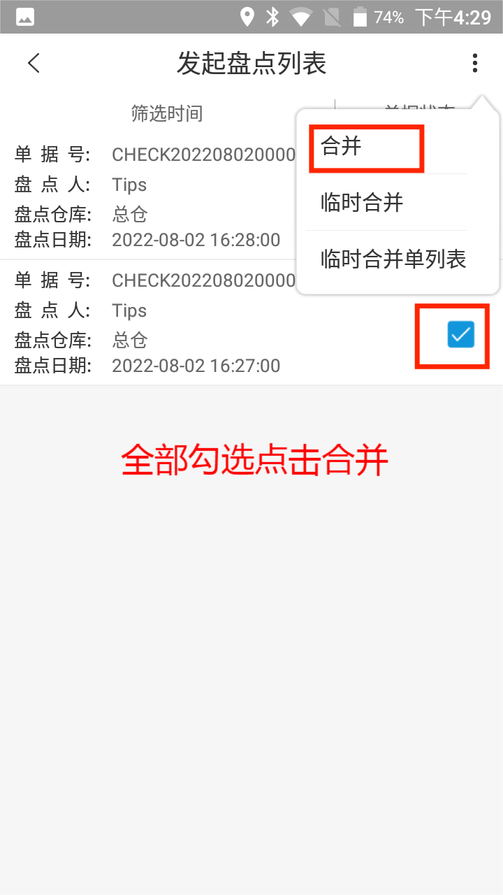 二、进入对应单据右侧盘点列表,勾选盘点单点击右上角选择合并;
