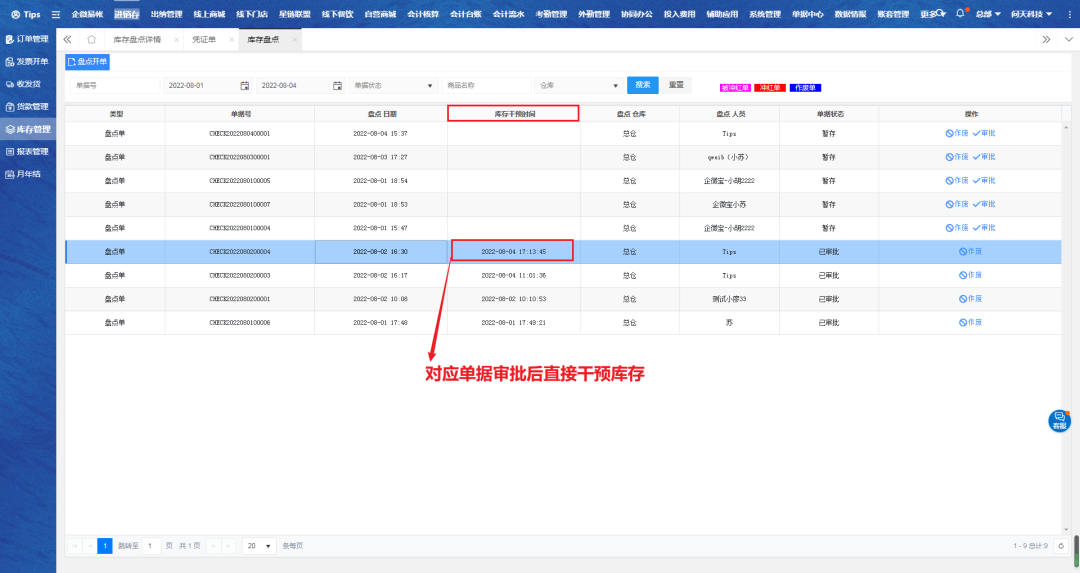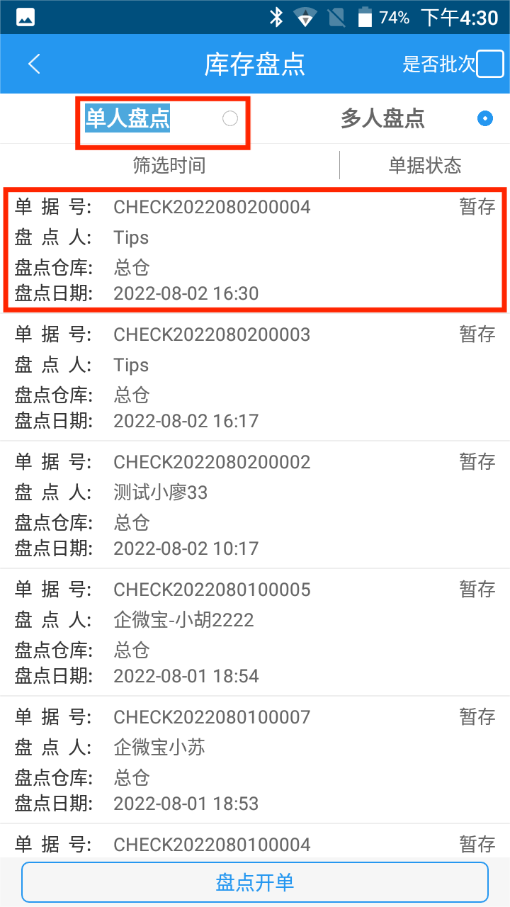 保存后单据自动更新在列表,多人盘点点击对应单据右侧加入盘点,按以上步骤发起盘点单即可。