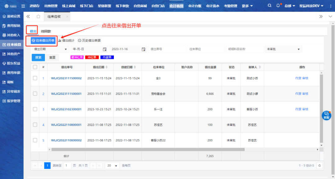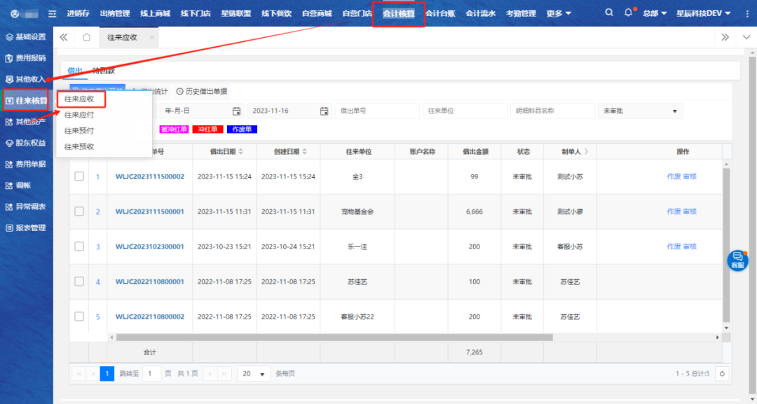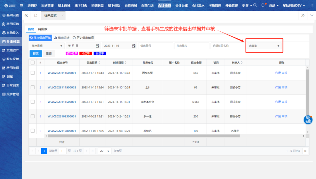 二、对应审核人进入电脑端往来应收页面,筛选未审批单据,查看手机生成的往来借出单,进行审核。