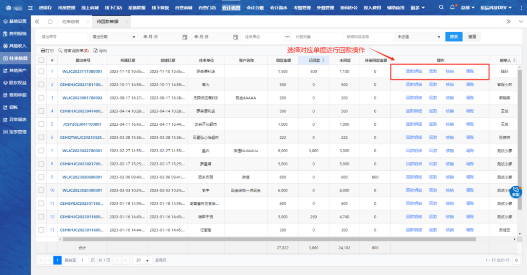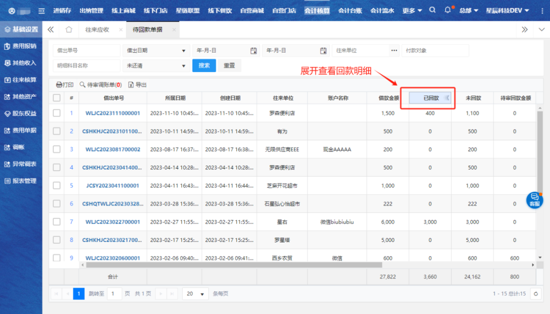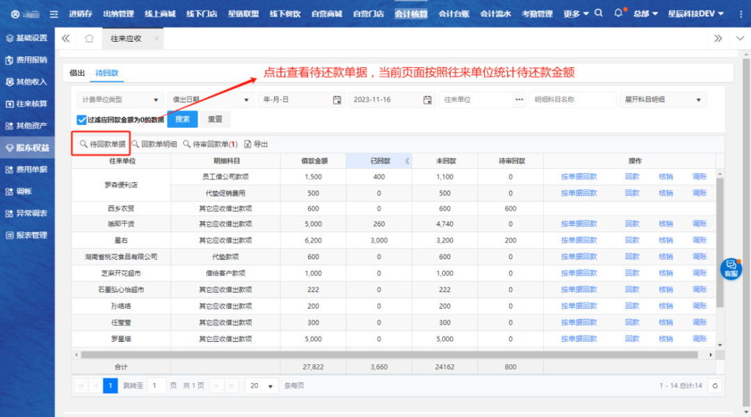 当前页面按照往来单位统计待回款金额,具体单据需要点击左上角查看。
