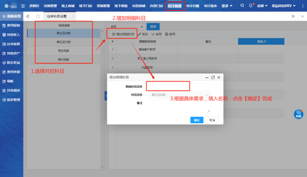 进入【会计核算】-【基础设置】-【往来科目设置】,选择科目名称,根据需求新增明细科目。