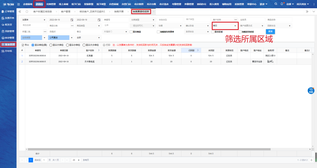 二、进入销售票据明细表也可筛选所属区域进行查看该区域下的客户发票单据。