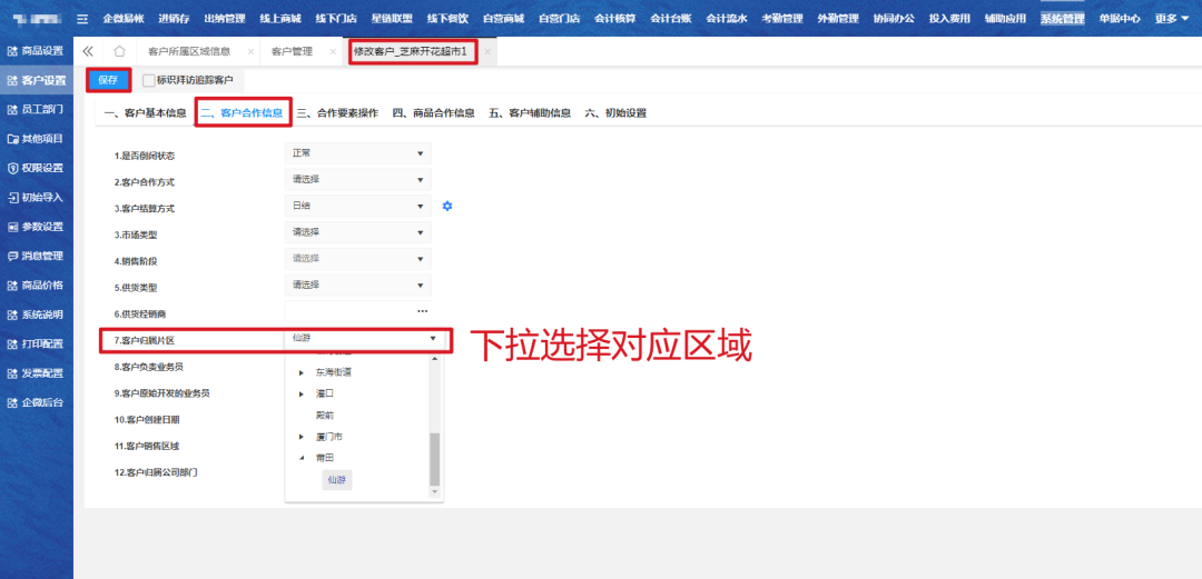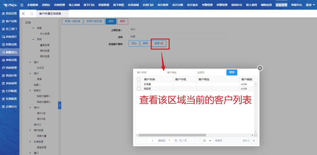 电脑端入口:【系统管理】-【客户设置】-【客户所属区域信息】