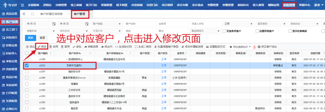 一、进入客户管理页面,选择对应客户,点击进入修改页面;