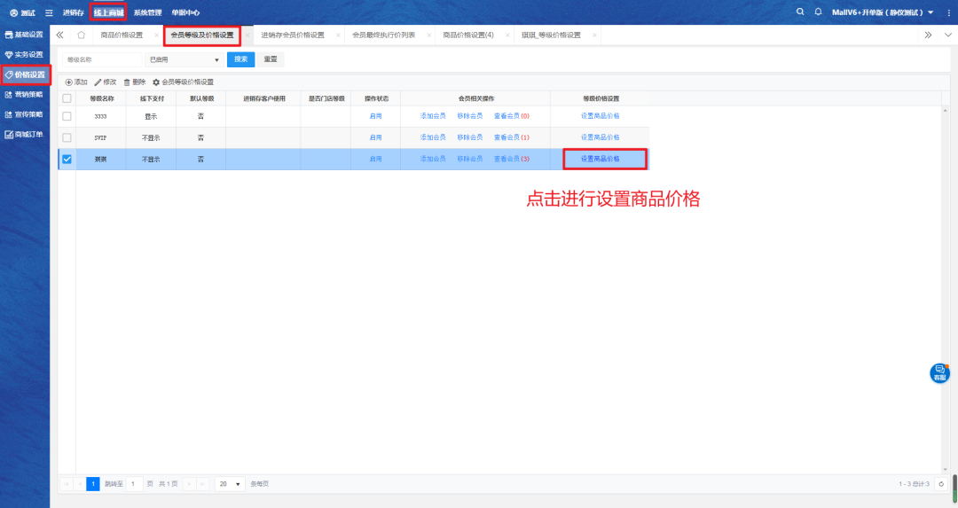 一、在会员等级及价格设置页面,选择对应会员等级,点击进行设置商品价格;