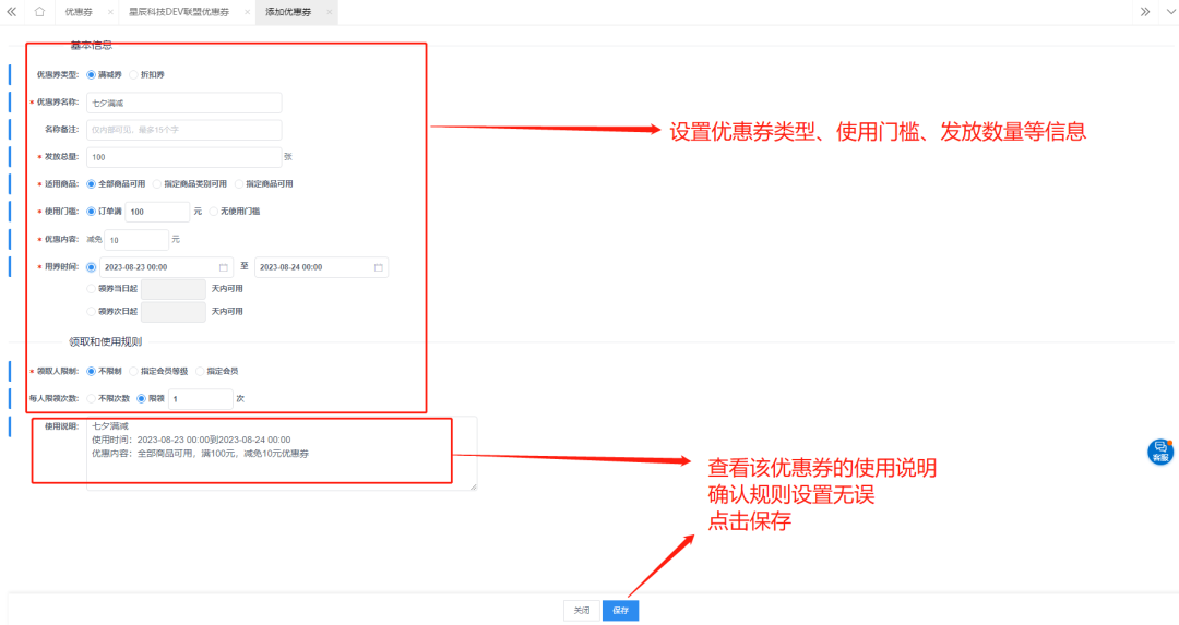 设置优惠券类型、使用门槛等,可预览该优惠券的使用说明,确认无误点击保存,